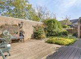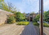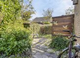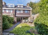 Het hoge groen aan de voorzijde zorgt voor privacy in de keuken. De achtertuin van goed formaat is gesitueerd op het zuiden. Het grote terras, uitgevoerd in hout, biedt ruimte een aan loungeset en een tafel met stoelen. Verder zie je veel groen in de tuin, een elektrisch bedienbaar zonnescherm en een stenen (fietsen)berging. Op het dak van de berging zijn 4 zonnepanelen geplaatst en achter de poort is een apart kadastraal perceel, met parkeergelegenheid voor de auto.