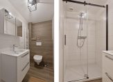 De badkamer biedt alles wat je nodig hebt: een ruime douche met lage instap, een wastafelmeubel met spiegelkast, een handdoekenradiator en een wandcloset. Een douchegordijn hoort tot het verleden, want deze badkamer heeft een fraaie douchewand met zwarte rail en een glazen deur.