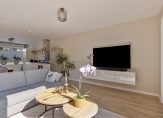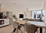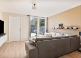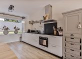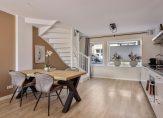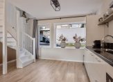 Grote ramen aan de voorzijde en openslaande tuindeuren aan de achterzijde zorgen voor veel lichtinval in de woonkamer en open keuken. Met een oppervlakte van ca. 38 m2 is er meer dan genoeg ruimte voor een grote hoekbank, tv-meubel en een eettafel. Stucwerk op het plafond en de muren zorgen voor een woonkamer met een strakke uitstraling en onder de laminaatvloer ligt vloerverwarming. Naast de trap is de meterkast en dat is te verklaren, want vroeger was hier de voordeur met hal.