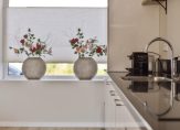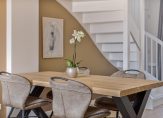 In de keuken staat een lange wandopstelling in een lichte kleur, met een donkere plint en aanrechtblad. De inductie kookplaat, afzuigkap, oven, vaatwasser en koel-/vriescombinatie zijn ingebouwd. En is het eten klaar, dan is het maar een paar stappen naar de eettafel.