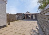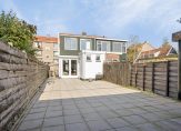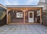 In de achtertuin staat een ruime berging/hobbyruimte met overdekt terras. De tuin is geheel bestraat, waardoor er nauwelijks onderhoud is en er altijd een plekje is om in de zon te zitten. Aan de kant van het pad is een erfafscheiding geplaatst, gemaakt van ruwe houten schaaldelen. Dit zorgt voor een schutting met een natuurlijke, rustieke uitstraling.