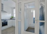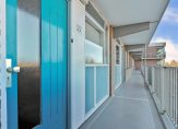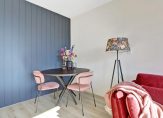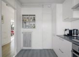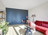 Dit appartement bevindt zich aan het begin van de galerij, waardoor je niet ver hoeft te lopen vanaf de lift en trap. Achter de blauwe voordeur is de hal, die uit twee delen bestaat. In het eerste deel is ruimte voor een kapstok en in het tweede, grootste deel hangt de intercom. Links in de hal is een deur naar de lichte woonkamer, met grote ramen aan de zuidoostkant en uitzicht naar de Rosariumlaan en het Rosariumpark. De blauwe muur bij het eetgedeelte kleurt goed bij de laminaatvloer en de radiatoren zijn voorzien van een strakke ombouw.