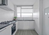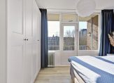 Aan de voorzijde van het appartement is de dichte keuken, waar in 2016 een fraaie keukenopstelling in een L-vorm is geplaatst. Deze keuken biedt veel bergruimte en de 5-pits gaskookplaat, afzuigkap, oven, vaatwasser, koelkast en vriezer zijn ingebouwd.Naast de woonkamer is de ruime slaapkamer, met een deur naar het balkon. Ook hier wordt de sfeer bepaald door de mooie vloer-, wand- en plafondafwerking. Verbouwen hoeft niet, dus je kunt je gaan focussen op de styling naar eigen smaak. En goed om te weten; de slaapkamer biedt genoeg ruimte om een tweepersoonsbed en een grote garderobekast neer te zetten!