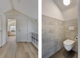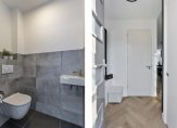 Wat aan de buitenzijde opvalt, zijn het grote raam tot vloerhoogte en de stijlvolle voordeur. Via deze deur loop je de hal in die, net als de rest van de woning, smaakvol is verbouwd. De pvc visgraatvloer ligt op bijna de hele begane grond en recht voor je is de toiletruimte met fraai tegelwerk, een wandcloset en een fonteintje.