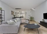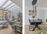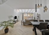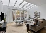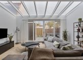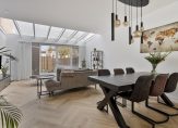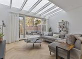 De keuken staat in open verbinding met de uitgebouwde woonkamer. Het resultaat is een spectaculaire leefruimte met twee grote schuifdeuren naar de tuin en een glazen dak, wat voor veel lichtinval zorgt. Er is genoeg plek voor een grote zithoek, tv-meubel en een 6-persoons eettafel.