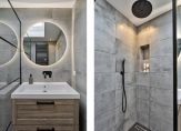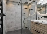 De toiletruimte met wandcloset is uitgevoerd in dezelfde stijl als de badkamer, waar een lichtkoepel in het dak is geplaatst. Blikvangers in de badkamer zijn de inloopdouche met glazen wand, het wastafelmeubel, de ronde spiegel met verlichting en de verschillende zwarte elementen.