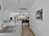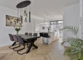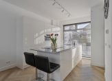 Voor kookliefhebbers is de keuken een fantastische plek, met een hoge kastenwand en een kook-/spoeleiland. Bij het eiland, met een natuurstenen blad, is plek om twee hoge stoelen neer te zetten en alle benodigde apparatuur is ingebouwd: een inductie kookplaat met afzuiging, een vaatwasser, Quooker, combi-oven, koelkast en een vriezer.