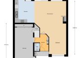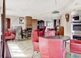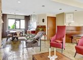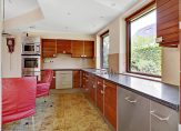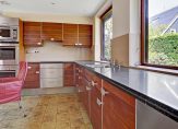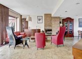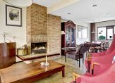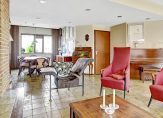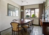 In de woon-/eetkamer word je verrast door de ruimte en de aangebouwde serre zorgt voor nog meer ruimte. Aan de voorzijde is een eetgedeelte, bij de keuken is een tweede eetgedeelte en het zitgedeelte bevindt zich bij de open haard. De keukenopstelling, van massief hout, is net als de rest van het huis in de sfeer van de jaren 70. Het granieten aanrechtblad is later geplaatst en de inbouwapparatuur is van een latere datum.
