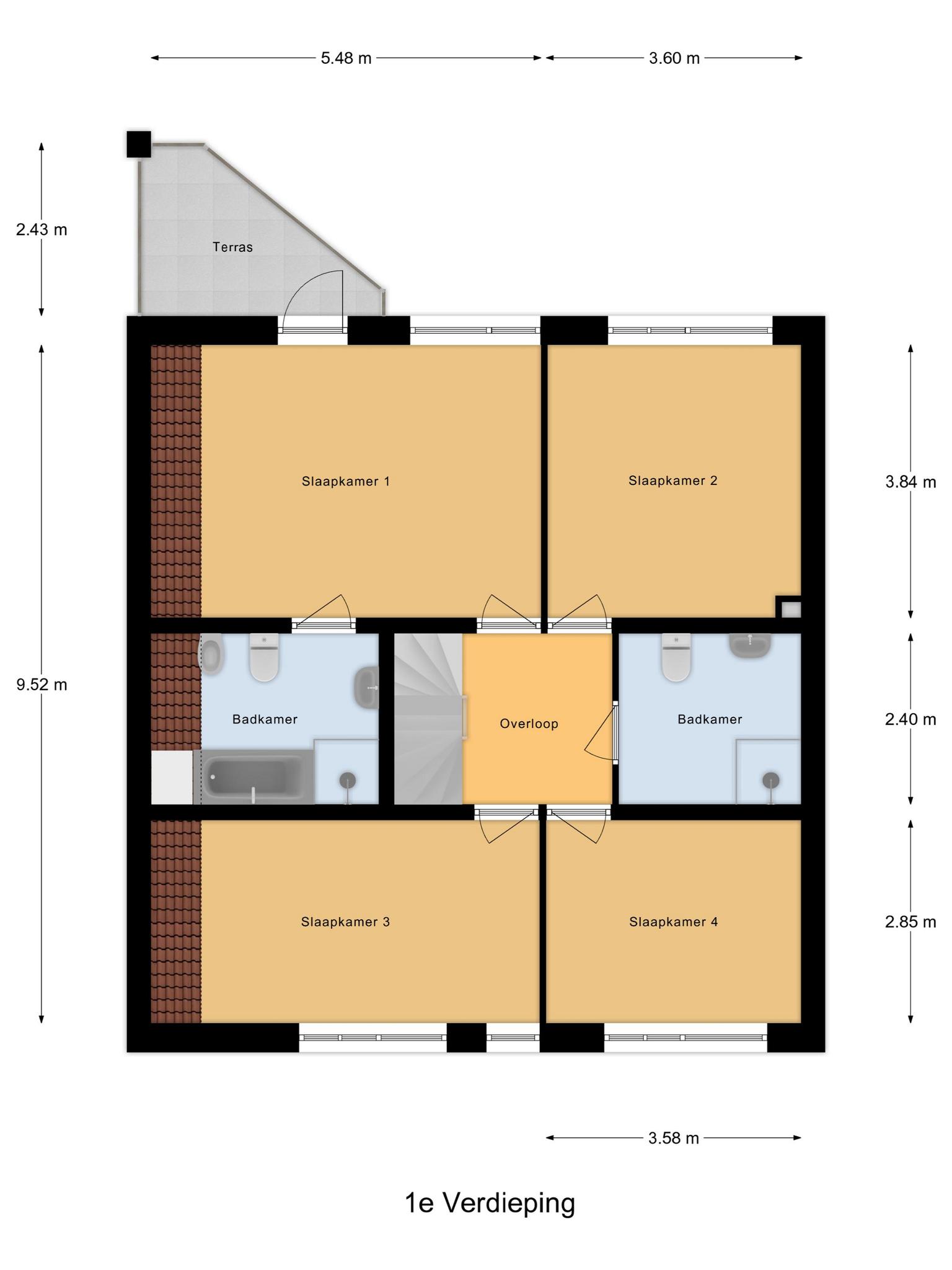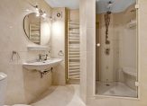 Voor de drie overige slaapkamers is er een tweede badkamer, te bereiken vanaf de overloop. Hier heb je de beschikking over een Turks stoombad waar ook in gedoucht kan worden, dubbele wastafel en een toilet.