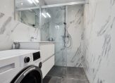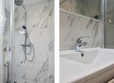Naast de toiletruimte is de fraaie badkamer, te bereiken vanuit de hal. Marmerlook wandtegels zijn gecombineerd met grijze vloertegels en de ruimte is ingedeeld met een ruime inloopdouche, mooie douchewand, wastafelmeubel en de aansluiting voor de wasmachine.