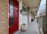 Vanuit de hoofdslaapkamer is het balkon te bereiken, gesitueerd op het zuiden. Dit is een fijne plek om buiten te zitten, met uitzicht over de daken van de woningen en het plantsoen voor de deur.