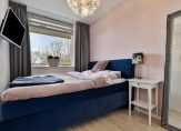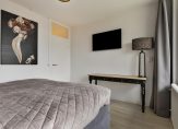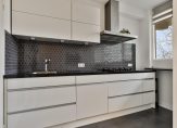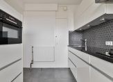 Aan de andere zijde van het appartement is de dichte keuken, waar de kookliefhebber heel gelukkig van wordt. De dubbele, moderne wandopstelling biedt veel bergruimte en het aanrechtblad is van stijlvol, zwart graniet. De tegels op de achterwand passen perfect in het geheel en de gaskookplaat, afzuigkap, vaatwasser, combi-oven en koel-/vriescombinatie zijn ingebouwd. In de berging/provisieruimte hangt de HR-ketel uit 2019.