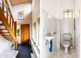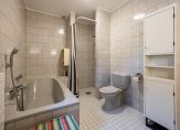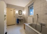 Gelijkvloers wonen is mogelijk dankzij de slaapkamer en badkamer op de begane grond. In de ruime tweepersoonskamer ligt, net als in de woonkamer en keuken, een mooie houtlook pvc-vloer. De badkamer, origineel uit de jaren ’80, is ingedeeld met een ligbad, aparte douche, toilet en een wastafel.