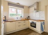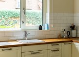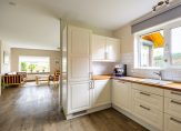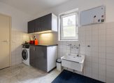 In de halfopen keuken staat een lichte U-opstelling met een houten aanrechtblad en het spoelgedeelte bij het grote raam. De keramische kookplaat, afzuigkap, combi-oven, vaatwasser (2023), koelkast en vriezer zijn ingebouwd. Naast de keuken is de bijkeuken met een marmeren vloer, uitstortgootsteen en de wasmachineaansluiting. (deur van keuken naar bijkeuken staat niet op de plattegrond). Vanuit de bijkeuken is er toegang tot een ruime wijn-/provisiekelder.
