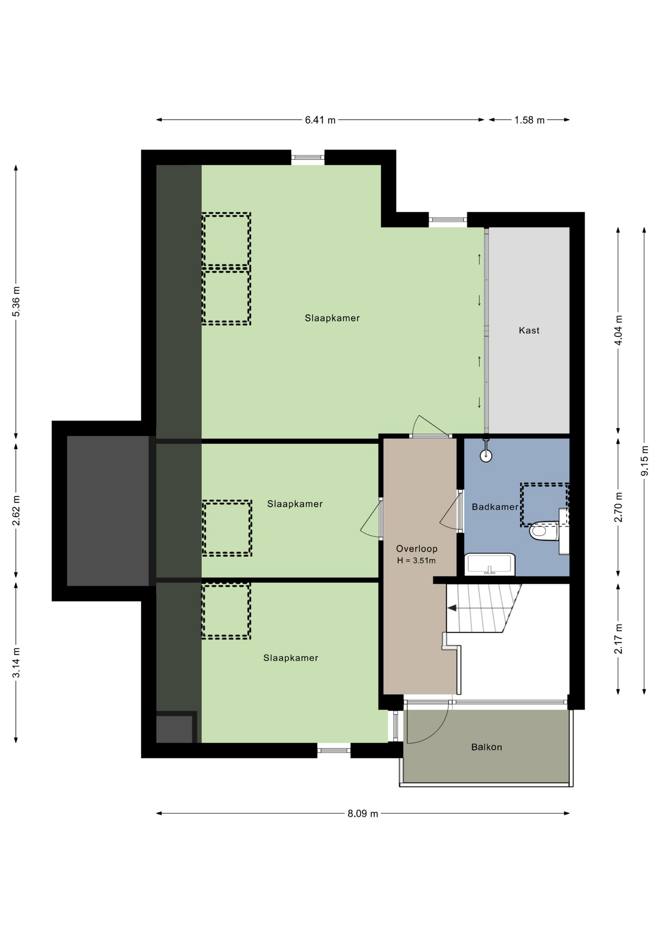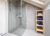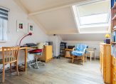 Er zijn drie slaapkamers op deze verdieping, allemaal met een of twee dakramen in het schuine dak. De grootste kamer, ingericht als werk-/muziekkamer, heeft een meer dan 1.50 meter diepe kastenwand en een pelletkachel. Ook is er een badkamer op deze verdieping, die ruimte biedt aan een inloopdouche, toilet en een wastafelmeubel.