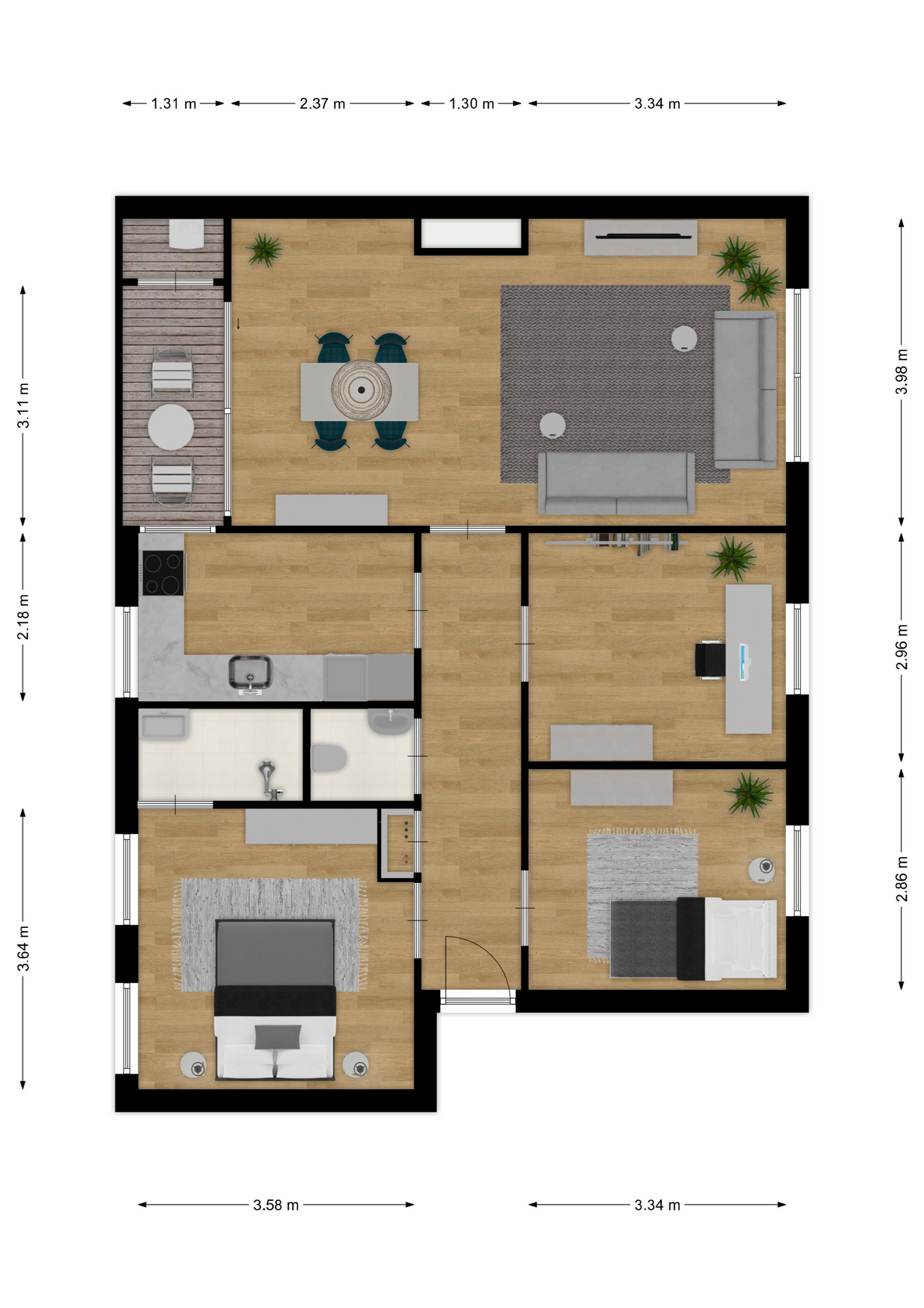 – In de woonkamer en 1 slaapkamer ligt een mooie houten vloer;