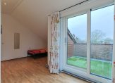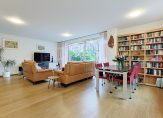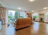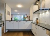 The entrance hall leads to a fully renewed meter cupboard with 3-phase power, and a spacious, luxuriously finished guest toilet. The living room and open-plan kitchen form a harmonious and light-filled living space, thanks to large windows on two sides. The kitchen is fully equipped with high-quality appliances, including a Miele dishwasher, induction cooktop, microwave, steam oven, refrigerator, freezer and close-in boiler — perfect for both everyday comfort and entertaining.