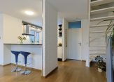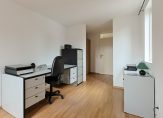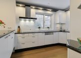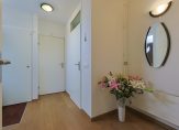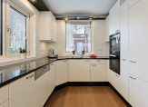 De entreehal geeft toegang tot de volledig vernieuwde meterkast met 3-fasen aansluiting en een royaal, keurig afgewerkt toilet met hangend closet en fonteintje. De woonkamer met aansluitende woonkeuken vormt een lichte en elegante leefruimte dankzij de grote raampartijen aan twee zijden. De keuken is compleet uitgerust met hoogwaardige inbouwapparatuur, waaronder een Miele vaatwasser, inductiekookplaat, magnetron, oven met stoomfunctie, koelkast, vriezer en close-in boiler — ideaal voor zowel dagelijks gebruik als het ontvangen van gasten. De verhoogde eetbar is zowel praktisch in het gebruik en dient tevens als een mooie scheiding tussen het woon-, en kookgedeelte.