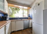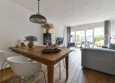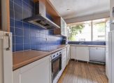 Begane grond woning: Hal met toilet, garderobekast en deur naar woonkamer. Wat een mooie ruimte heb je hier, die je op verschillende manieren ook kunt indelen! Door de grote kunststof schuifpui naar de achtertuin en de vide is er heerlijk veel lichtinval en op de grond liggen eiken vloerdelen. De te renoveren keuken met inbouwapparatuur ligt aan de voorzijde van de woning.
