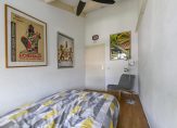 Ground floor: Hallway with a toilet, coat closet, and door leading to the living room. The living room is a bright and flexible space that can be arranged in many ways. Thanks to the large sliding doors to the backyard and the mezzanine, there’s lots of natural light, and the floor is laid with oak planks. The kitchen, which could benefit from renovation, is located at the front of the house and includes built-in appliances.