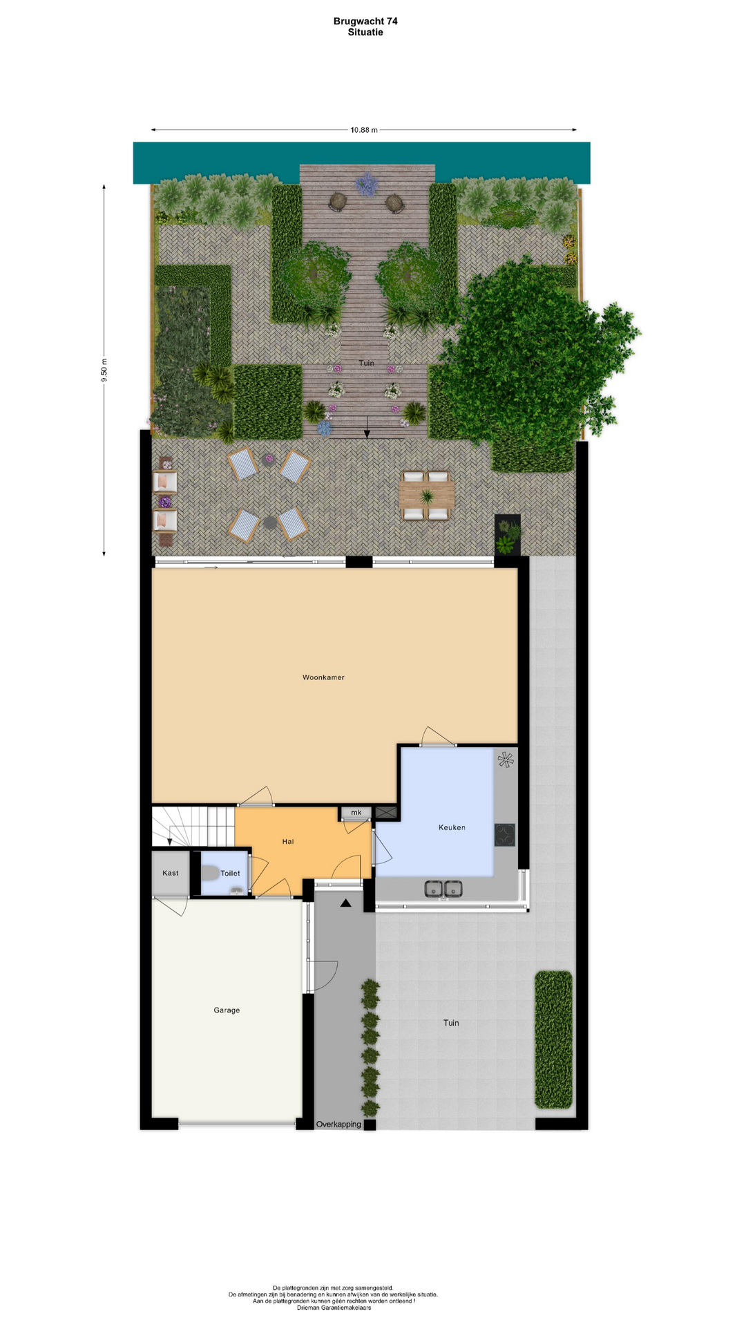 De villa beschikt over een parkeerplaats op eigen terrein naast de inpandige garage. De voortuin geeft wat extra privacy, terwijl de ruime achtertuin op zuidwesten optimaal profiteert van de zon gedurende de dag. De tuin (met verlichting)  grenst aan het water met ruim daarachter het wandel en fietspad langs de Dwarswatering.