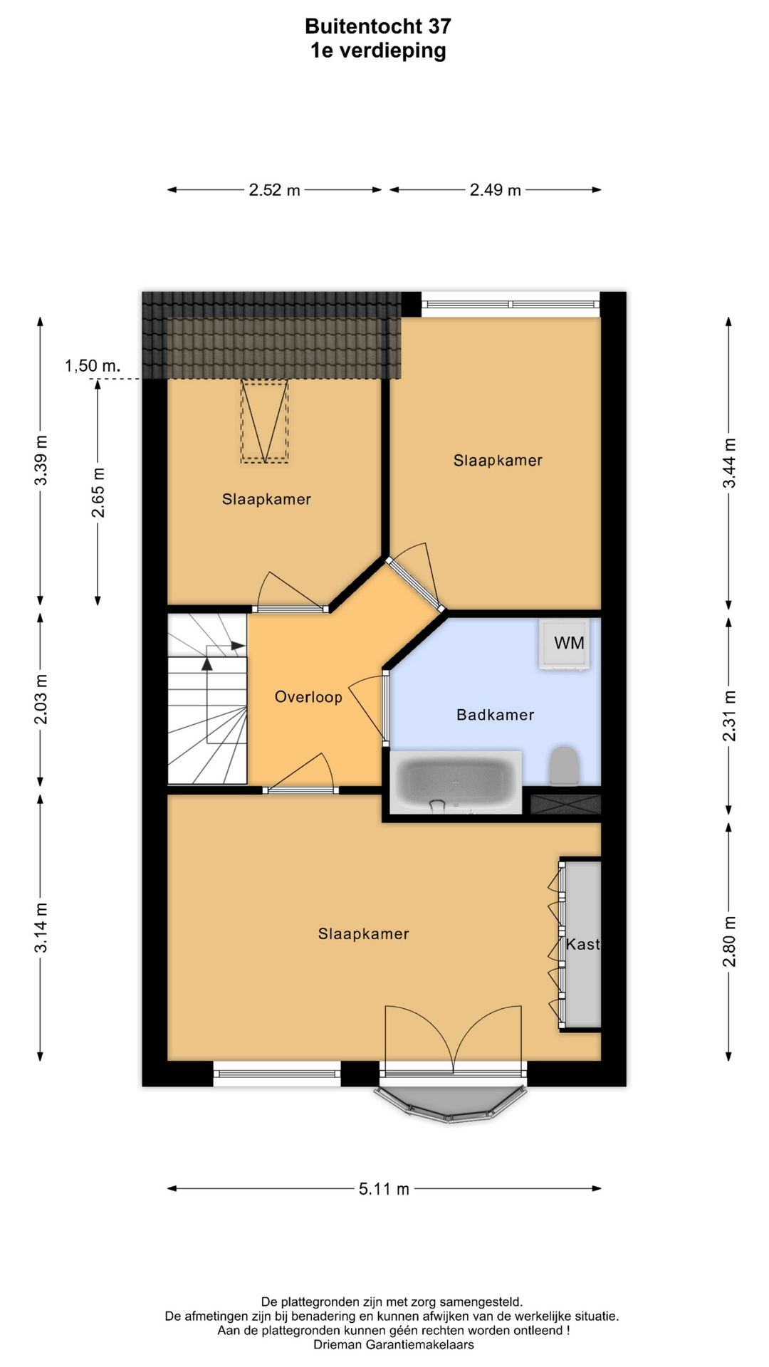 Op de eerste verdieping bevinden zich drie goed bemeten slaapkamers. De twee kamers aan de achterzijde profiteren van extra ruimte dankzij de dakkapel, terwijl de slaapkamer aan de voorzijde is voorzien van een sfeervol Frans balkon. De badkamer is ruim opgezet en beschikt over een douche (in bad), ligbad, wastafel, toilet en wasmachineaansluiting.