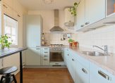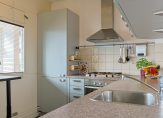 De keuken is verrassend ruim en van alle gemakken voorzien. Denk aan een koel-vriescombinatie, gaskookplaat, oven, vaatwasser én zelfs een weggewerkte wasmachine. In de hal vind je nog een handige vaste kast en toegang tot de badkamer, met een zitbad en douche, toilet en wastafelmeubel — compact, maar helemaal compleet.