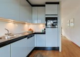 At the front is the semi-open kitchen, equipped with built-in appliances. The internal garage is also accessible from the hallway.