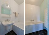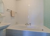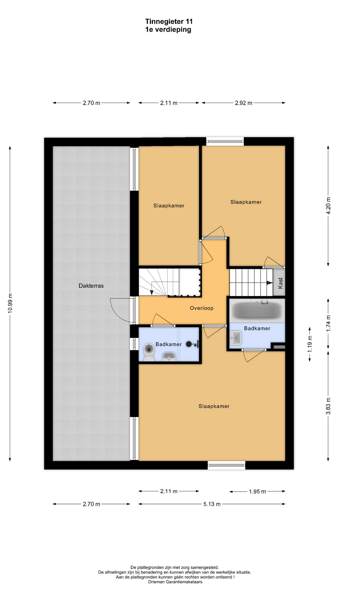 Overloop met toegang tot het royale dakterras (bij buren verbouwd tot extra kamer – biedt dus mogelijkheden!). Er zijn drie slaapkamers (circa 5.13 x 3.75, 4.20/3.20 x 2.92 en 4.20 x 2.11 m) waaronder de ouderslaapkamer met eigen badkamer voorzien van ligbad en wastafel. De tweede badkamer is bereikbaar vanaf de overloop en beschikt over een douche, wastafel en toilet.