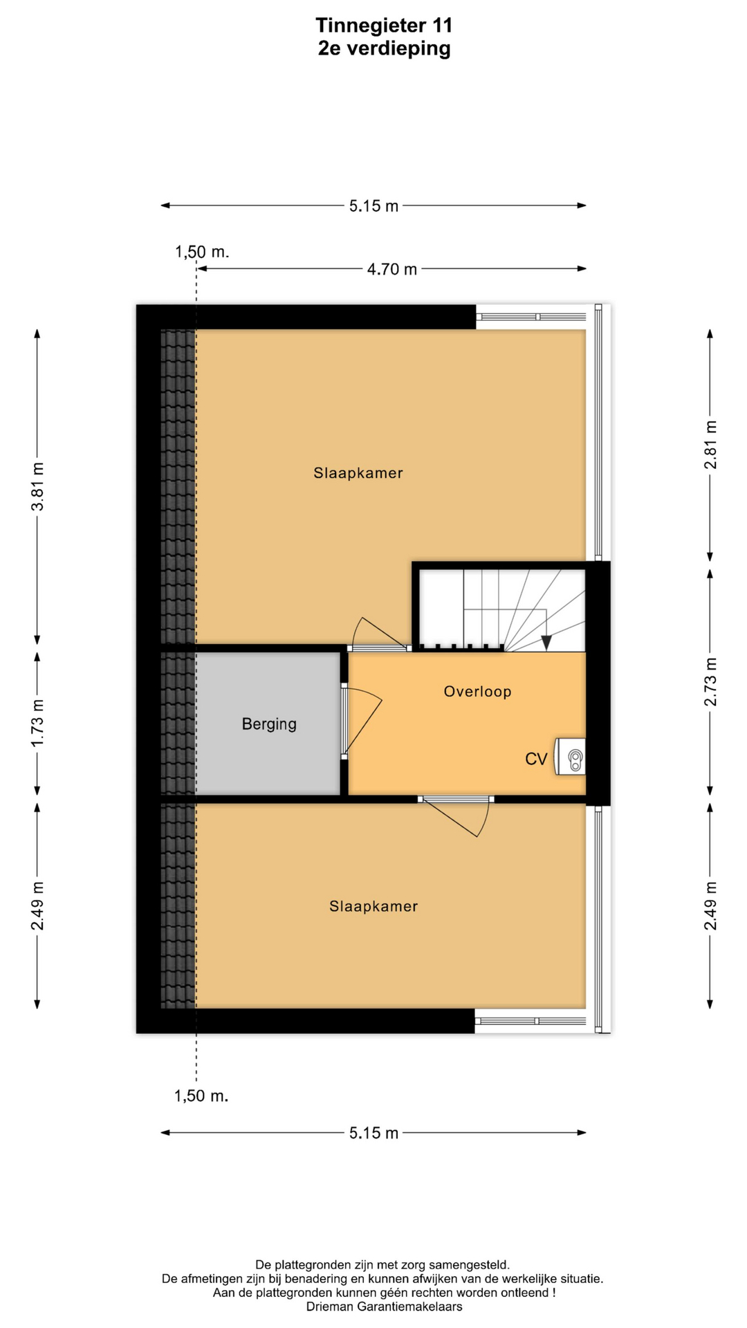 Ruime voorzolder met CV-opstelling/mechanische ventilatie en toegang tot twee grote slaapkamers (circa 4.70 x 3.81/2.81 en 4.70 x 2.49 m).