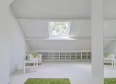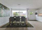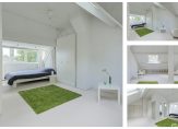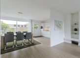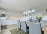 Door de verrassende Z-vorm op de begane grond is er een perfecte verbinding tussen koken en wonen Aan de achterzijde is een prachtig grote leefkeuken met deur naar de achtertuin. Deze witte, Deense design keuken is uitgerust met veel laden, een vaatwasser, koel/vries combinatie, gaskookplaat, combi-oven en er is zelfs een wasmachine ingebouwd.