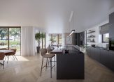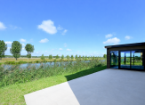 De ruime hal met vide geeft direct gevoel van ruimte. De royale lichte woonkamer heeft hoge glaspartijen met zicht op het water aan twee zijden en openslaande deuren. In de fraai aangebouwde serre is de plek voor de open keuken. Hier lopen binnen en buiten in elkaar over mede door de drie schuifpuien. Je kunt koken en eten met een panoramisch uitzicht.