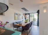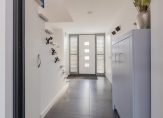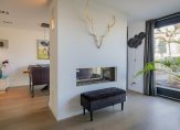 Voordeur met glaspartij, ruime hal met luxe toiletruimte en trapkast. De zwart stalen deur met glaspanelen biedt toegang tot de royale living. Deze woonkamer is in te richten in een zitruimte, televisieruimte en eetkamer en voorzien van een doorkijk gashaard achter glas, fraaie stuukplafond met inbouwspots, eikenhouten vloerdelen en twee schuifpuien en deur naar tuin. De open keuken heeft een Italiaanse design inrichting van Effiti en valt op door de matglazen werkbladen, de design afzuigkap en fraaie wit hoogglans kasten. Achter de keuken is er nog een grote provisieruimte.