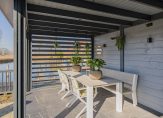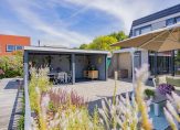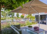 De goed aangelegde achtertuin is 14 meter breed en 9 meter diep en voorzien van een groot terras en fraaie veranda. De veranda heeft twee heathers, shutters en sunscreens. De privé ligplaats grenst direct aan de tuin en er is walstroom aanwezig.