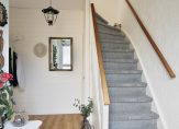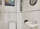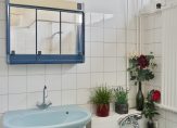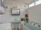 Overloop met toegang tot drie slaapkamers en een ruime badkamer met ligbad, douche, tweede toilet en wastafel.