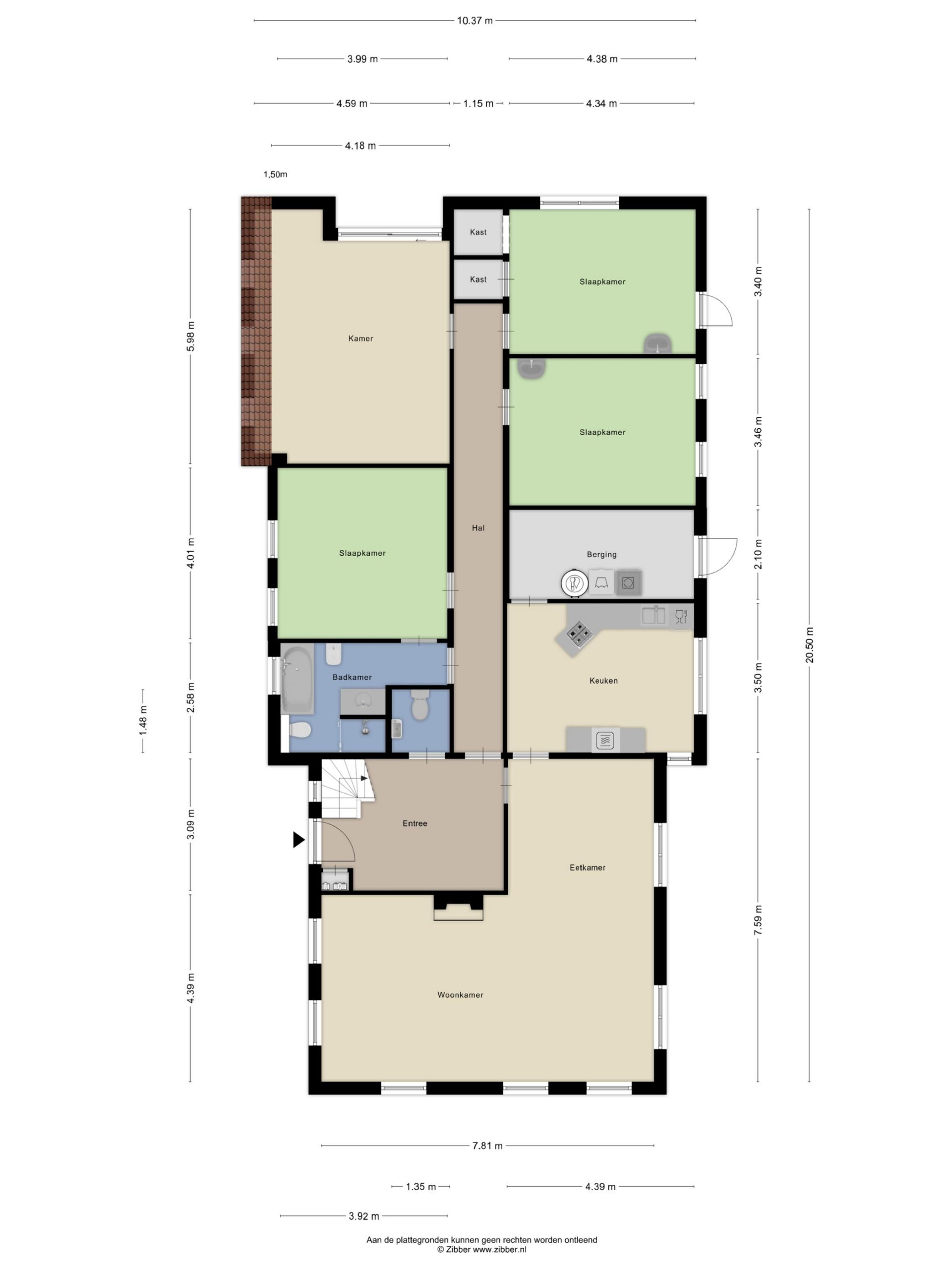 Op de begane grond zijn 4 slaapkamers van ca. 23, 16, 15 en 15 m², waarvan 2 zijn voorzien van eigen wastafel. De grootste slaapkamer is momenteel in gebruik als kantoor, is voorzien van een schuifpui en is zeer geschikt voor praktijkruimte aan huis. De slaapkamers liggen aan een lange gang met aan de overzijde een nette badkamer met douche, ligbad, 2e toilet, bidet en wastafel met meubel.