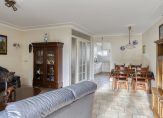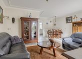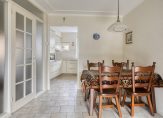 De tuingerichte woon-/eetkamer is een gezellige leefruimte, met een airco-unit bij het zitgedeelte en openslaande deuren naar de tuin en met rolluiken. Het stucplafond met sierlijsten is fraai, net als de halfopen verbinding met de keuken. In de keuken staat een lichte hoekopstelling met een keramische kookplaat, afzuigkap, combi-oven, vaatwasser en een koelkast.