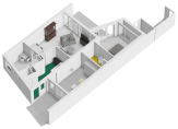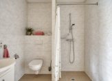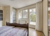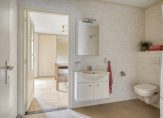 Gelijkvloers wonen is mogelijk dankzij de slaapkamer en badkamer op de begane grond. In de slaapkamer staat een grote kastenwand met schuifdeuren en de badkamer is ingedeeld met een inloopdouche, een toilet en een wastafelmeubel en heeft vloerverwarming.