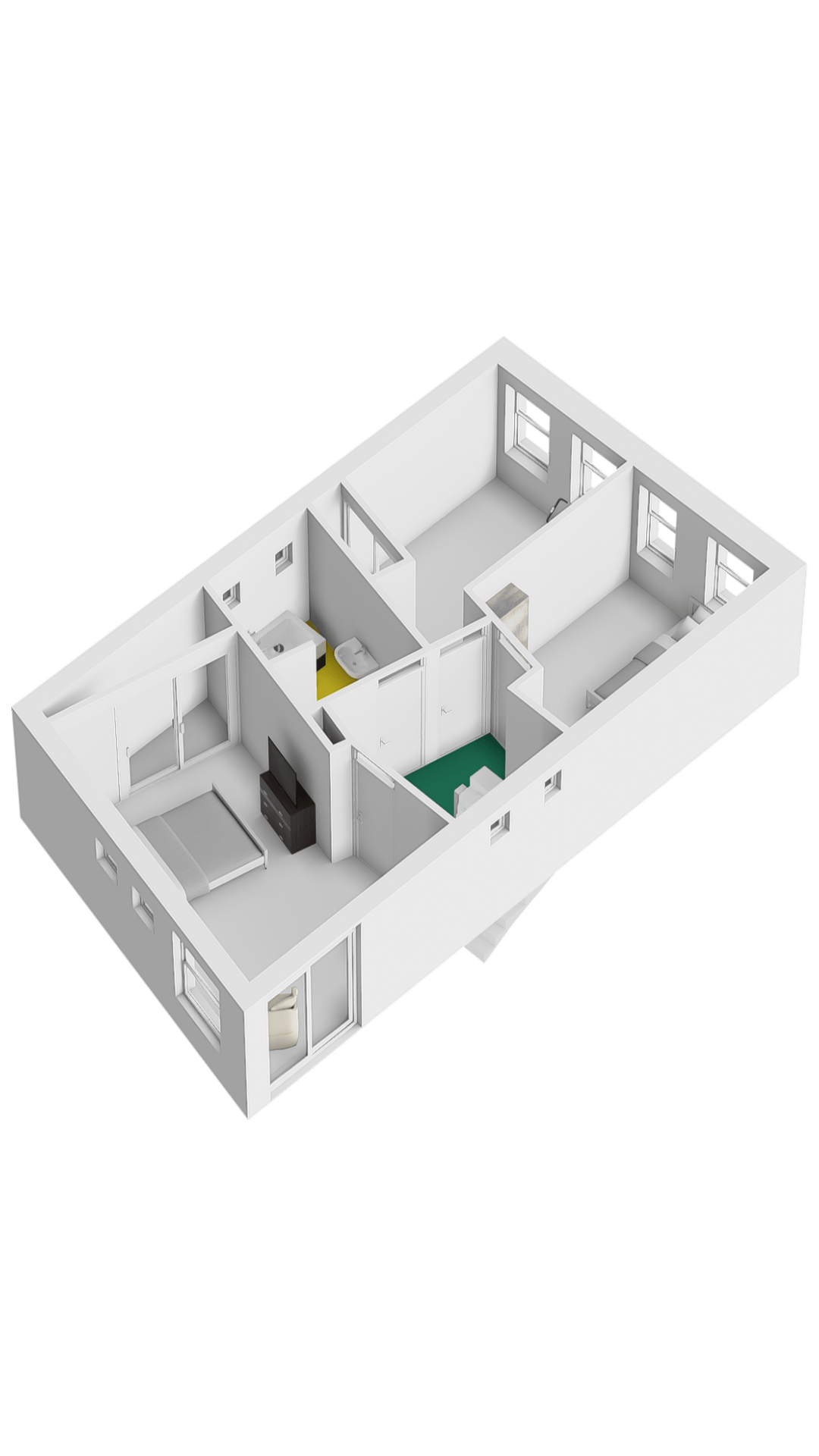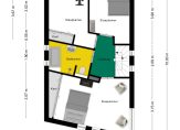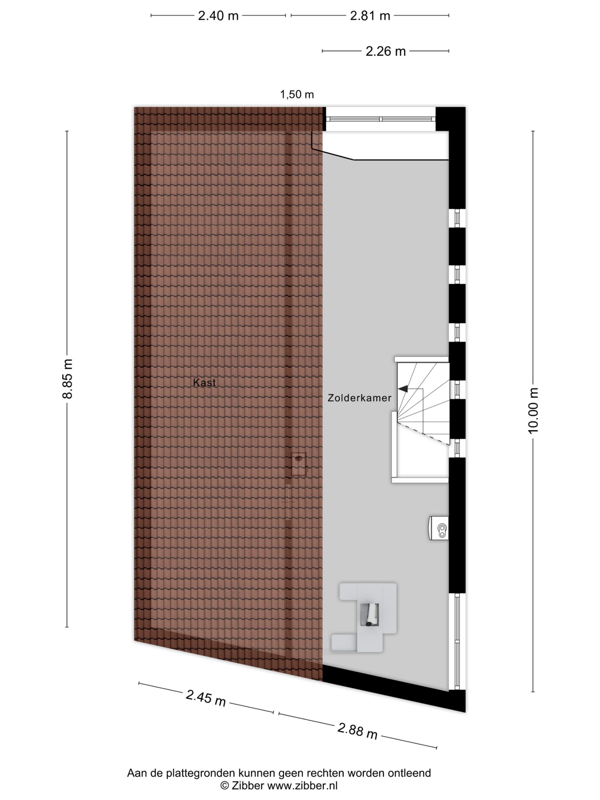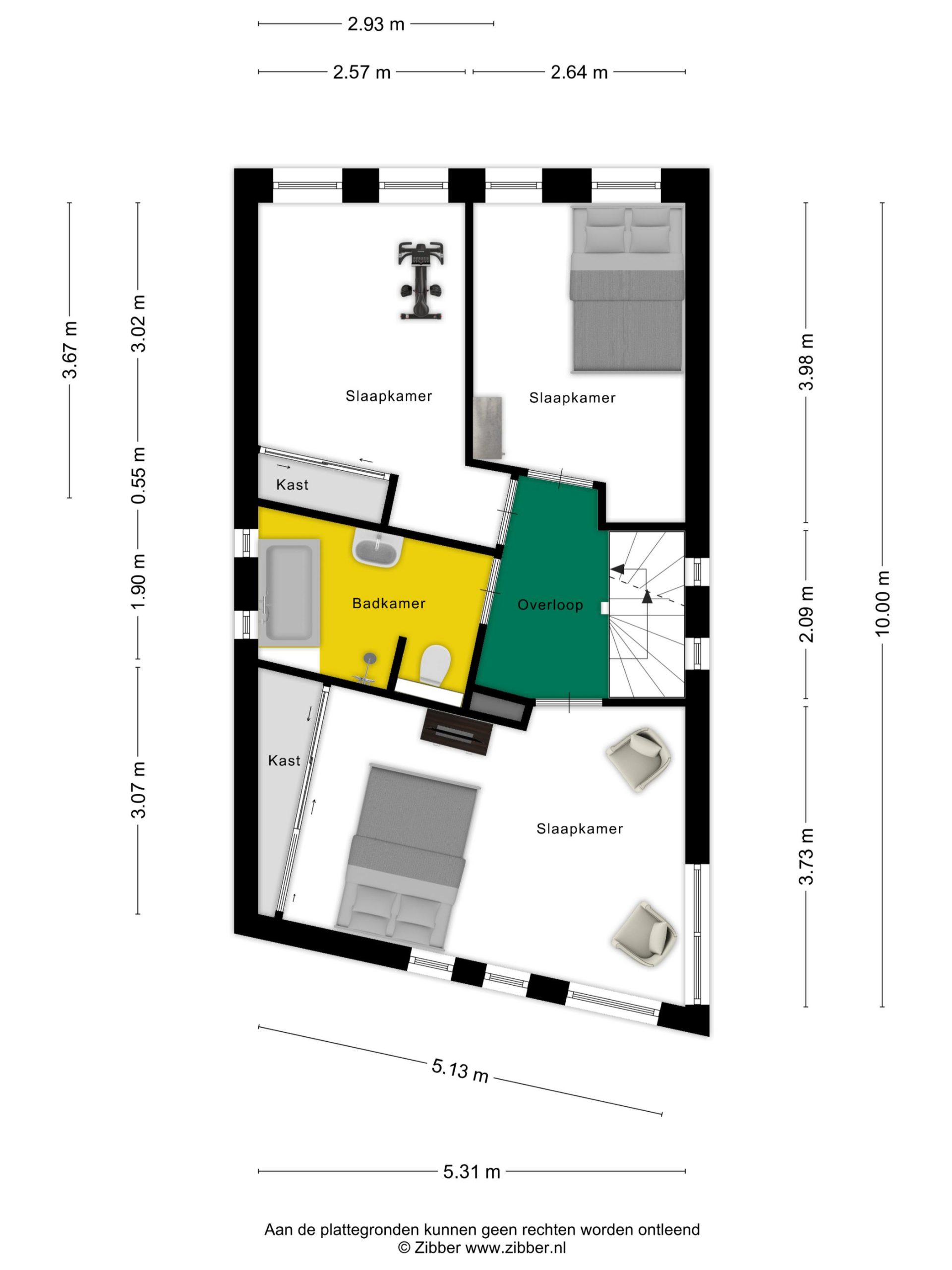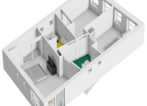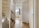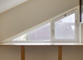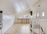 Een vaste trap geeft toegang tot de zolderkamer, waarvan een deel is ingericht als hobbyruimte. Aan de andere zijde, op een verhoging, is een tweede plek in huis om de wasmachine en droger neer te zetten. De situering van de trap maakt het mogelijk om een overloop en twee (slaap)kamers te realiseren.