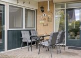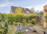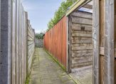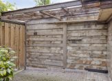 Niet alleen de voortuin, maar ook de achtertuin is keurig onderhouden. Een groot deel van de beplanting is groen, je ziet bodembedekkers en grind waardoor er relatief weinig onderhoud is. De achtertuin, met achterom, heeft een goede zonligging en een houten berging met overkapping voor de fietsen. Het deels overdekte terras met lichtkoepel en zonnescherm is een heerlijke plek om buiten te zitten.