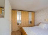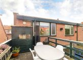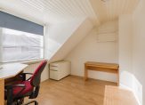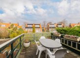 Via de open trap in de hal kom je op de overloop van de eerste verdieping. Direct bij bovenkomst vind je handige inbouwkasten. Er zijn 4 slaapkamers – 2 aan de voorzijde, 2 aan de achterzijde – en een badkamer met douche, toilet, wastafelmeubel en handdoek radiator. Een van de slaapkamers aan de achterzijde geeft toegang tot het zonnige dakterras. Hier zit je heerlijk. De tuinkast biedt bovendien handige bergruimte en er is een buitenkraan.