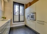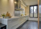 De ruime eethoek is gesitueerd voor de luxe, moderne keuken die door de Gaggenau apparatuur en de zee aan opberg- en werkruimte een lust is voor iedere kookliefhebber. De keukenapparatuur bestaat onder andere uit een oven, een magnetron, een warmhoudlade, koel-/vriescombinatie en een inductiekookplaat. Via de keuken komt u weer in de hal uit waar u ook naar de werk-/TV kamer kunt met een fraaie maatwerk boekenkast en een hoog raam met zicht op de straat. De gehele begane grond is voorzien van een natuurstenen vloer met vloerverwarming.