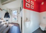 Entree, hal, toiletruimte met hangend toilet en fonteintje, trapkast met meterkast, vaste trap naar eerste verdieping en toegang tot woonkamer en keuken.