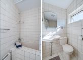 De eenvoudige badkamer is voorzien van een ligbad met douche, wastafel, toilet en radiator.