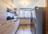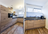 De woonkamer heeft een trapkast en een deur naar de achtertuin met plek voor een heerlijke zithoek en een berging, gelegen op het noordoosten. De open keuken ligt aan de voorzijde van de woning en is voorzien van inbouwapparatuur, zoals een inductiekookplaat, RVS afzuigkap, vaatwasmachine, combi-oven/magnetron en losse koelkast met vriezer.