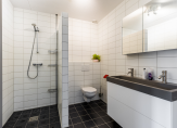 De nette badkamer is voorzien van een wastafel, inloopdouche en 2e hangend toilet.