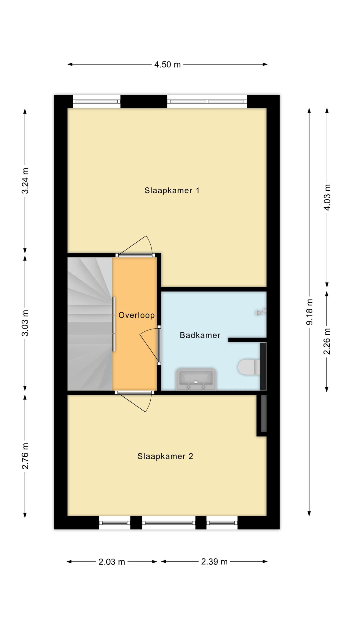 Vaste trap naar overloop welke toegang geeft tot 2 ruime slaapkamers en een badkamer.