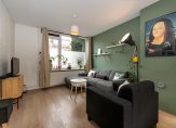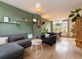 Aan de voorzijde komen we binnen in de hal, waar zich het toilet, de meterkast en een ruime bergkast bevinden. Uiteraard is hier ook de toegang naar de ruime woonkamer. Bij binnenkomst valt direct het vele licht op dat binnenkomt door de grote raampartijen aan zowel de voor- als achterzijde. De voorzijde leent zich goed voor een fijne zithoek. Aan de achterzijde is plek voor een ruime eettafel die daarmee in verbinding staat met de open keuken. De wanden zijn licht afgewerkt en er ligt een lichte laminaatvloer. De nette open keuken beschikt over vaatwasser, koelkast, combioven, gaskookplaat met afzuigkap. In de berging in de hal staat een 10 liter boiler voor snel warm water in de keuken.