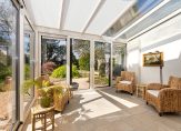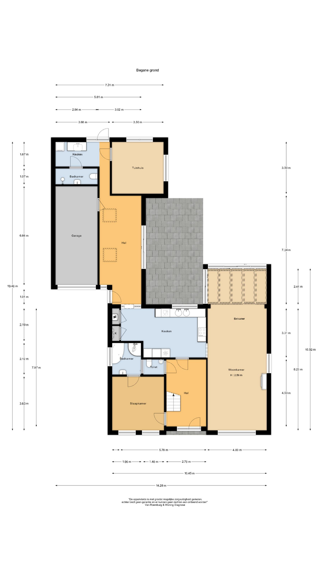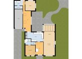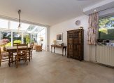Indeling: Entree/hal met toegang tot de slaapkamer met aangrenzende badkamer aan de voorzijde v.v. ligbad, douche en wastafel, toilet, ruime woonkamer met een oppervlakte van ca. 44 m2 met open haard, serre en een plavuizen vloer, woonkeuken (ca. 17 m2) met diverse inbouw-apparatuur, berg-/CV ruimte, open tussenkamer met schuifpui en zicht op de tuin, deur naar de garage, achterhal met witgoedaansluitingen, slaap- of werkkamer, badkamer met douche, wastafel en toilet. Eerste verdieping: Overloop, 2 ruime slaapkamers, badkamer met wastafel en mogelijkheid voor een douche.