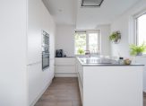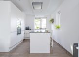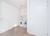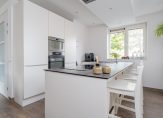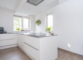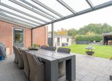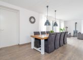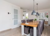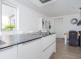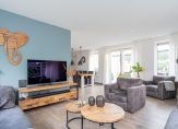 Via de ruime hal komen we in de lichte woonkamer, die dankzij de ramen aan drie zijden veel daglicht ontvangt. De erker geeft de ruimte een speels accent. Via de schuifpui heb je toegang tot de overkapping, waar je heerlijk kunt genieten van het buitenleven. In de koudere maanden blijft de warmte goed behouden, terwijl je in de zomermaanden onder de zonwering heerlijk beschut kunt zitten. De woonkamer biedt meer dan genoeg ruimte voor zowel een gezellige zithoek als een grote eettafel. De moderne, halfopen keuken is voorzien van een kookeiland en de gebruikelijke inbouwapparatuur. De bijkeuken is ruim en biedt niet alleen plek voor de wasmachine en droger, maar ook voor extra kastruimte. Hier bevindt zich ook het toilet.